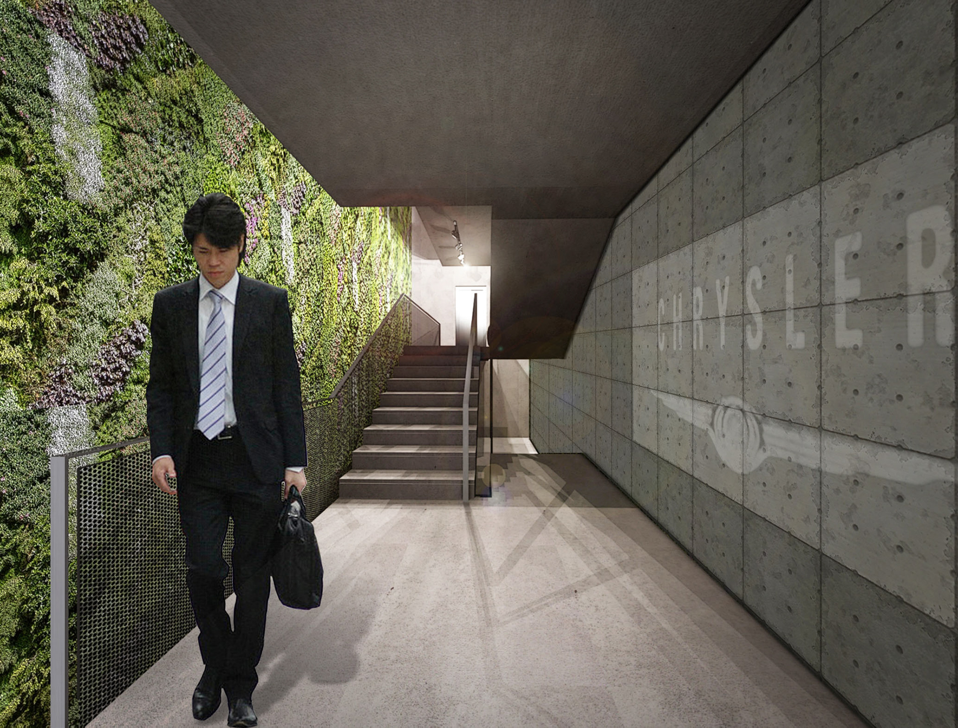 180 employees work at the headquarters of the S. Group of Companies (automotive import and distribution for Citroën, Chrysler, Jeep, Porsche, Lancia). Most of them use the main entrance of the office building located on Kifissias Avenue, one of the busiest highways in Athens. In addition to the main entrance a secondary way in that exclusively leads to the management offices on the 4th-5th-6th floor. The second entryway is accessible from a by-street and has a total surface of less than 33.5 sq.m. including the office stairway. Design brief challenge; despite its limited and limitative size, this auxiliary space is intended to serve as an exclusive passageway for VIP guests.