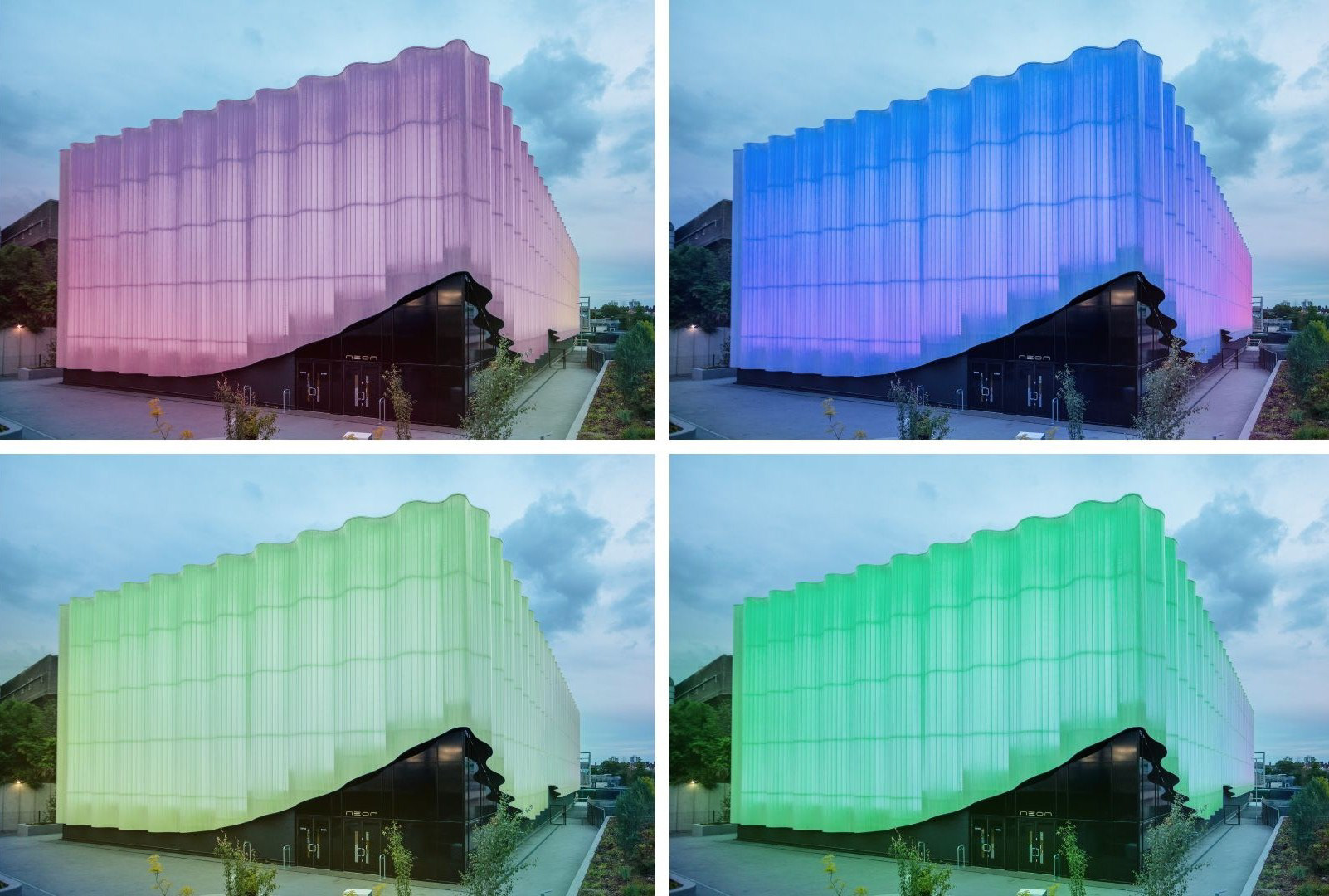 Designed to interact with natural light, the curtain facade’s wavy contours cast evolving patterns of light and shadow throughout the day, enhancing the structure’s connection to its surroundings. A multilayer digital system integrates translucent polycarbonate with LED pixels, enabling vibrant graphic displays that elevate visual appeal and offer interactive, unforgettable visitor experiences.