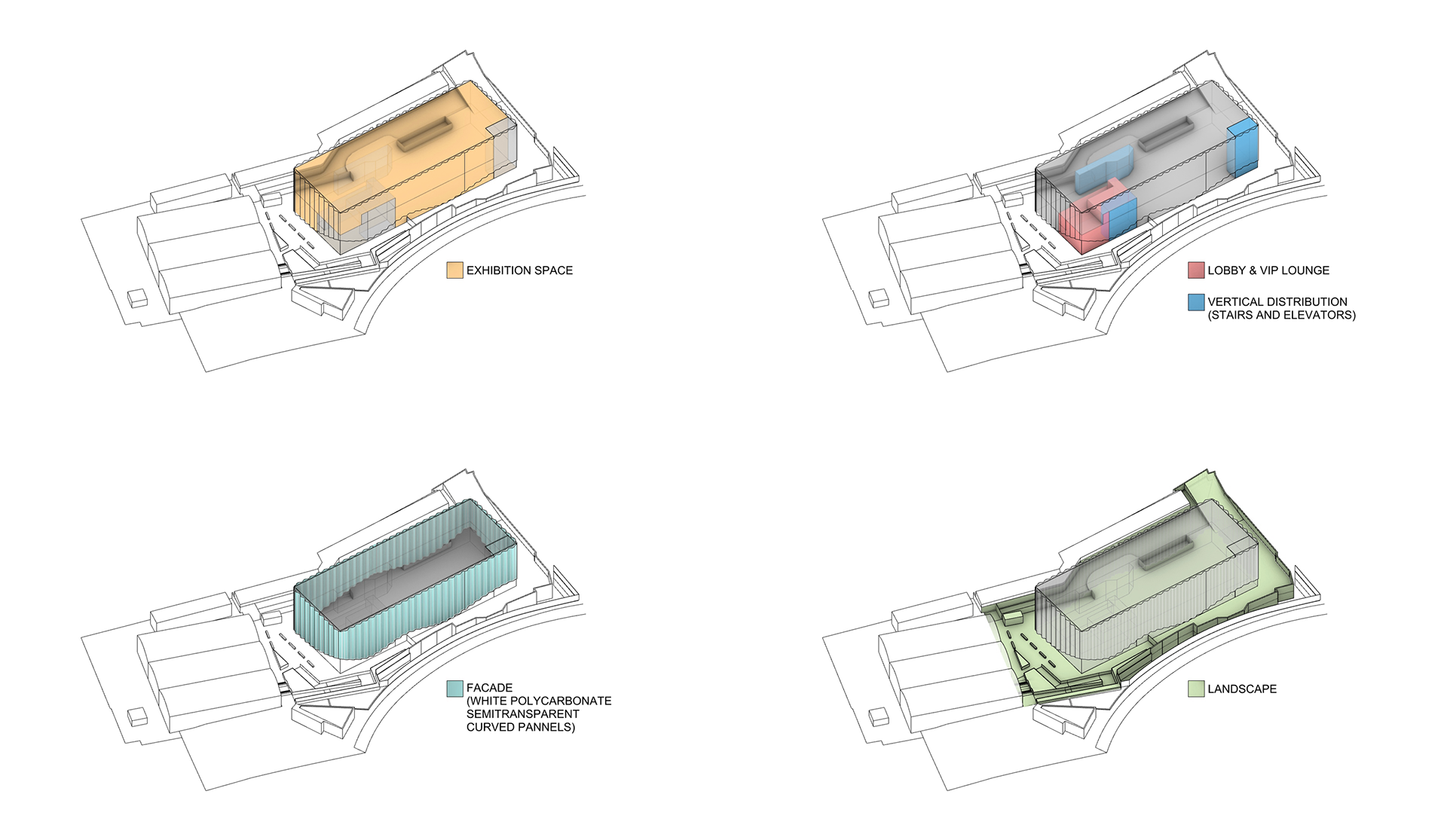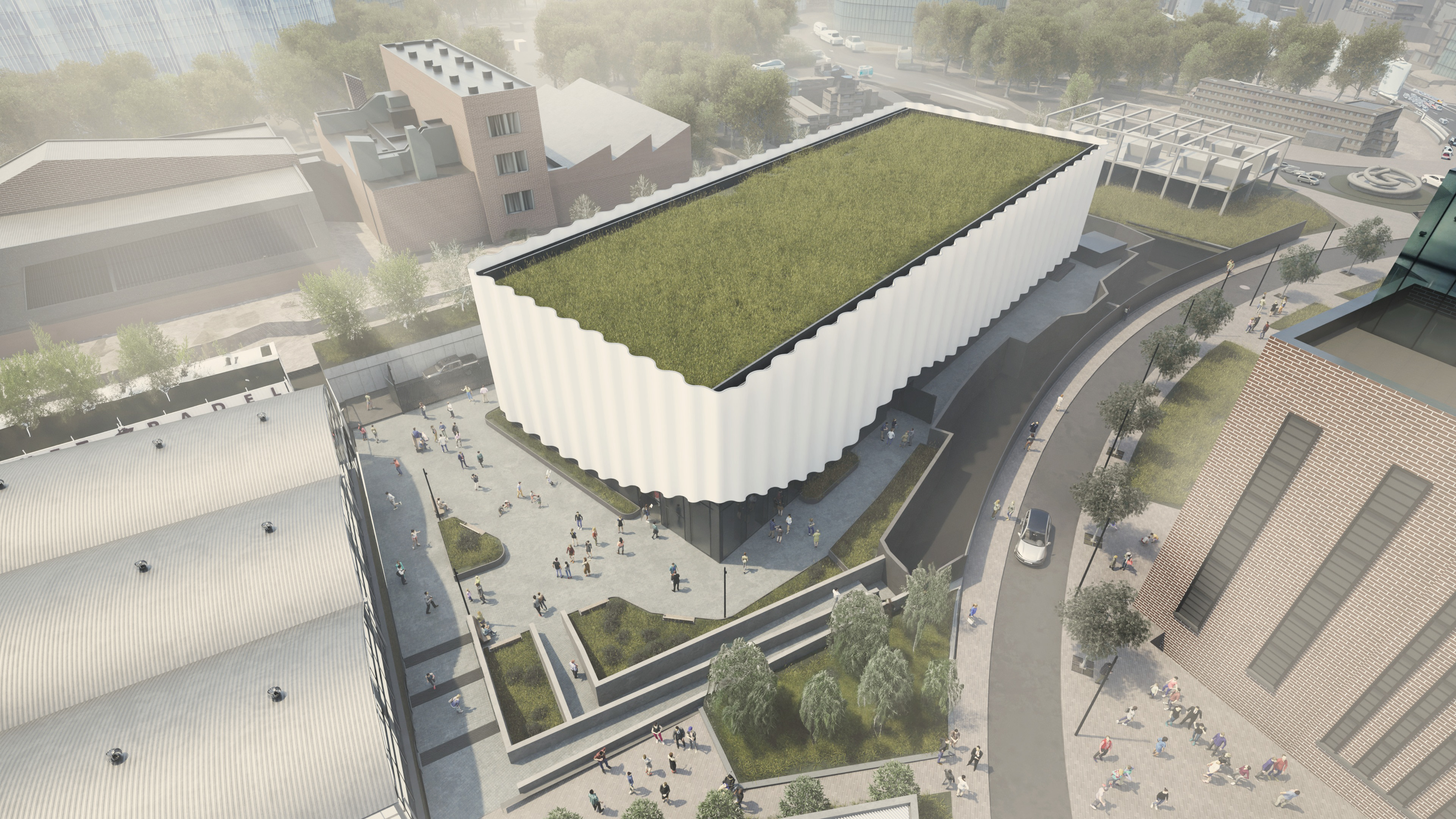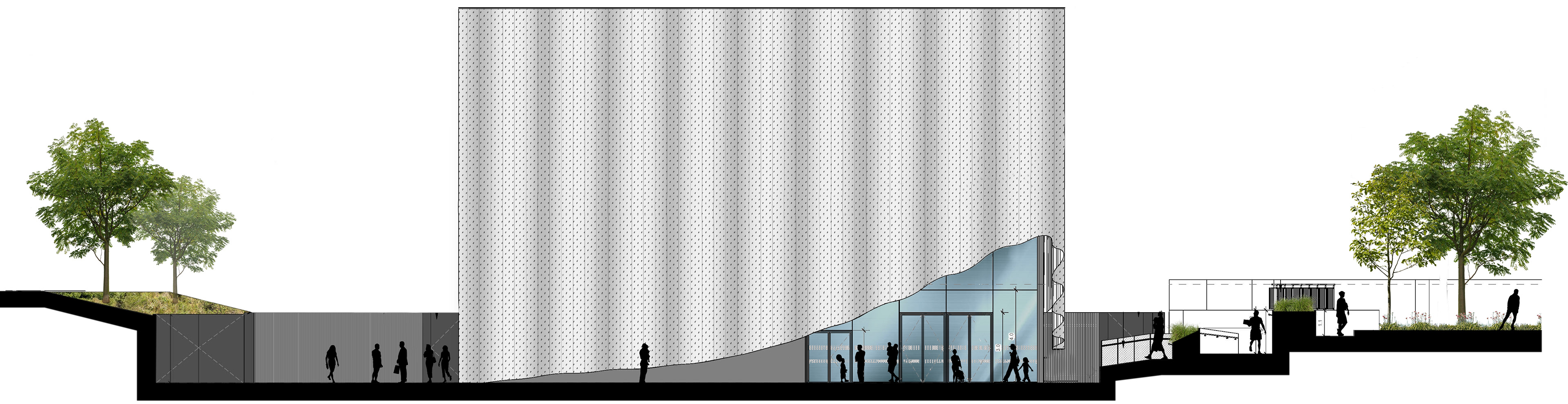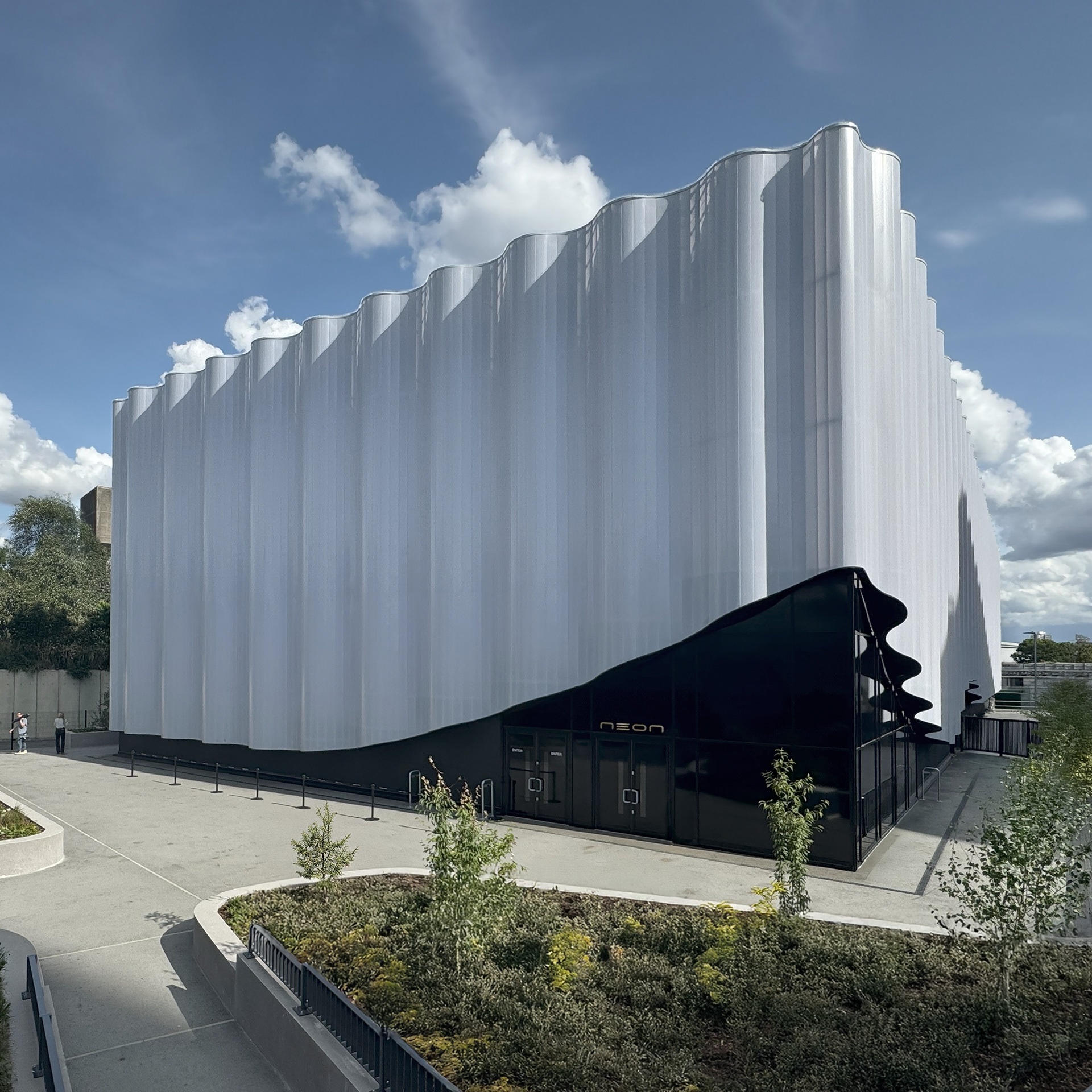 The structure features a dual-layer facade system combining functionality with striking visual impact. The inner layer forms the building’s core envelope, while the outer “curtain” facade, a flowing, wavy white veil, wraps the building in an elegant, sculptural form. Its undulating edges lift at key entrances, creating dynamic, inviting access points.