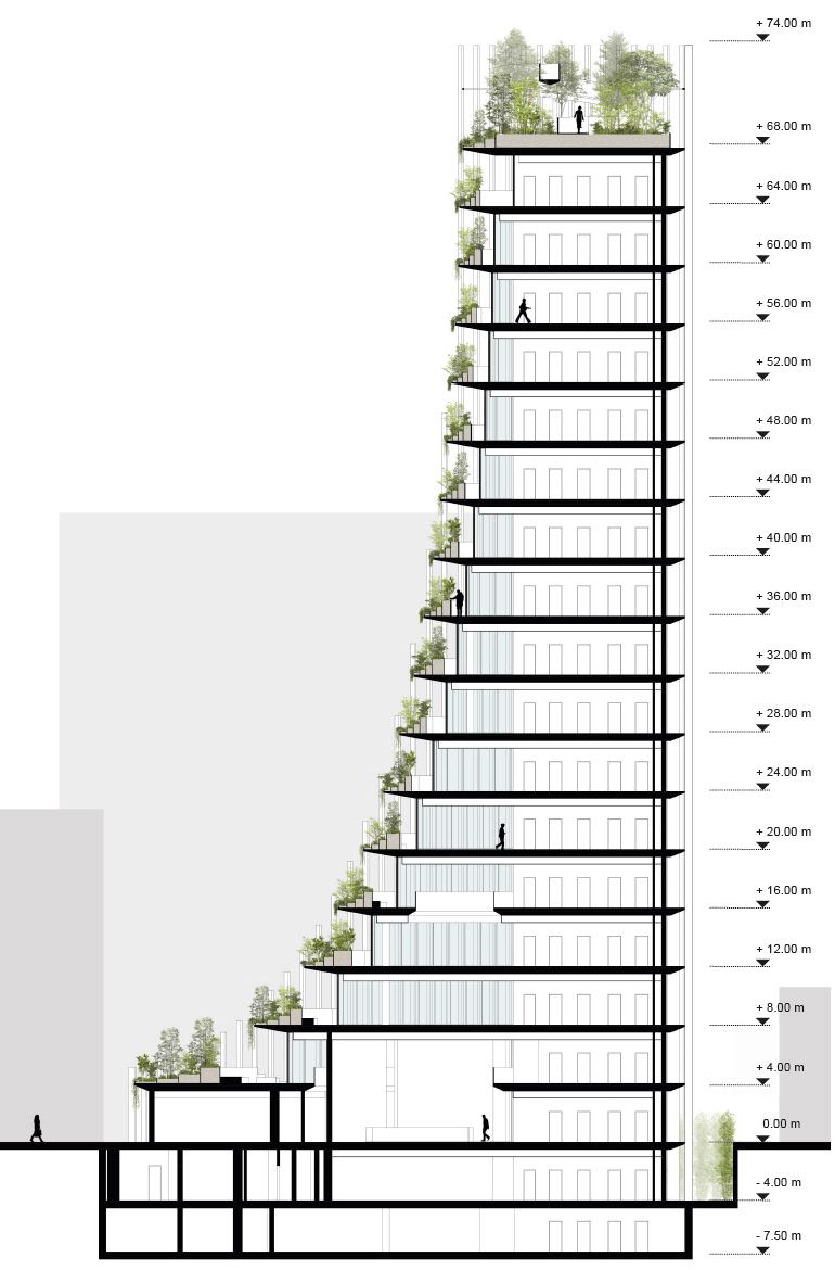 The building is located on the border between the historic urban fabric of Milan and the contemporary new developments of the business district. It is located in a hinge point between the new and the traditional, between the future and the past. We imagined a tower able to dialogue with the different souls of the city. The South facade opens towards the centre of Milan with long open terraces where the green luxuriant brings nature into each of the 18th office floors.