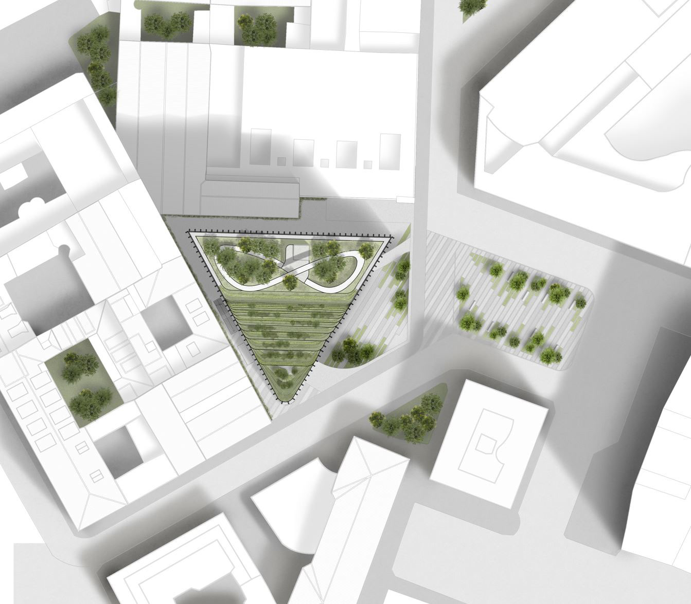 From the very beginning of the design process, our intention was to imagine a building able to take all the advantages deriving from the complex triangular-shaped plot. At the same time, we wanted to offer a larger open public area towards South-East and minimise the footprint of the building. Following these principles, we generated an equilateral triangular-based prism where two faces are exposed South-East and South-West and the third face is looking North.