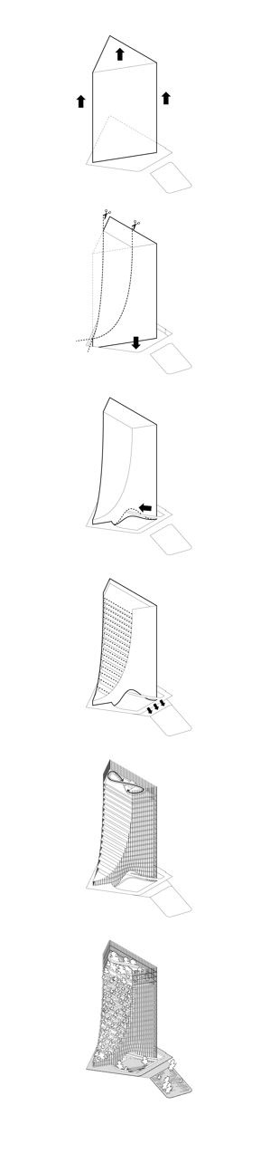 The local urban regulations impose that any new built volumes must be within the 60° inclined ideal planes generated from the ground line of the surrounding buildings. For this reason, but also with the intention to maximise the view towards the Centre of Milan (South), we decided to cut the original prism along a parabolic curvature. Additionally, the ground connection of the building was lowered to - 4.00 m from the street level with the goal to generate an underground square and spectacularise the access to the entrance lobby.